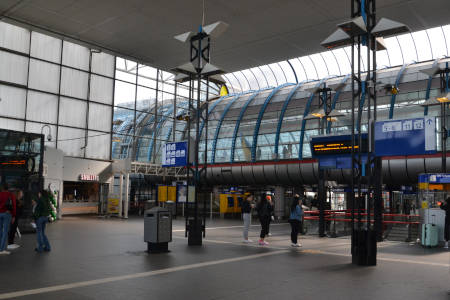 Onder: Alles aan dit stationsgebouw oogt groot. En dat geldt zeker voor de stationshal, die tot de grotere van ons land kan worden gerekend. Dankzij het vele glas is de ruimte bijzonder licht. Maar het meest opvallende kenmerk is het hooggelegen perron, dat letterlijk met overkapping en al dwars door de hal loopt. Overigens lijkt de ruimte erg overzichtelijk, maar schijn bedriegt...