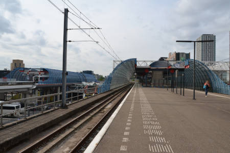 Het Amsterdamse station Sloterdijk is het absolute hoogtepunt in de stationsarchitectuur uit de jaren tachtig van de vorige eeuw. Zelfs na bijna veertig jaar doet het station allesbehalve gedateerd aan; het is één van de “benchmarks” onder de Nederlandse stations, waarbij tegenwoordig de treinen zelfs op drie niveaus het station passeren. Toen het werd gebouwd was dit het allereerste zogenoemde kruisingsstation van ons land, oftewel: een station waarbij twee lijnen en bijbehorende perrons elkaar ongelijkvloers kruisen. Daarbij kan men hier letterlijk in de vier windstreken reizen, want de perrons liggen vrijwel exact in noord-zuid en oost-west posities. Het oorspronkelijke station heeft drie laaggelegen perrons en één hooggelegen platform. Die laatste is duidelijk vanuit de stationshal te zien, de laaggelegen perrons zijn daarentegen letterlijk onder het gebouw verstopt. Inmiddels is station Sloterdijk al meerdere keren uitgebreid, in 1997 met een metroperron en sinds 2008 met een vijfde treinperron. Die laatste is onderdeel van de Hemboog, en staat daardoor los van de rest van het station. Het perron ligt op een hoogte van circa 13 meter, het heeft een eigen ingang én een eigen overkapping.