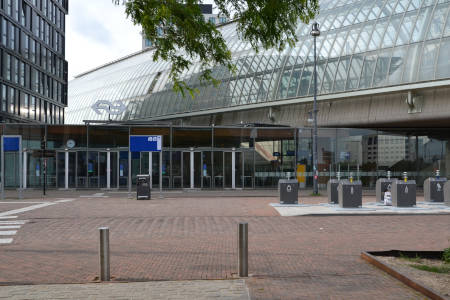 Boven: De blazen voorgevel van het stationsgebouw, met daaronder de wat teruggetrokken ingang. Glas en staal zijn de belangrijkste elementen van het stationsgebouw. Maar ook beton is in ruime mate aanwezig. Zo is het tamelijk groen ogende plein in feite een grote betonvlakte, waar onder zich nog zes sporen en drie perrons bevinden. Enige jaren geleden werd dit plein nog volledig heringericht. Het busstation, dat hier vroeger was, werd verplaatst naar een nieuwe plek.