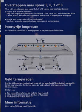 Onder: Het station is sinds 2017 voorzien van ov-poortjes. Daarbij is gekozen het station in drie “secties” te verdelen, waarbij het niet meer mogelijk is om zomaar van het ene naar het andere deel te lopen. Op bordjes in de hal staat aangegeven wat men moet doen om niet onnodig in- en uit te hoeven checken. Om van spoor 3 naar spoor 5 te komen, kan men het beste via het hooggelegen perron (spoor 11/12) gaan. Het station is er niet bepaald gebruiksvriendelijker op geworden...