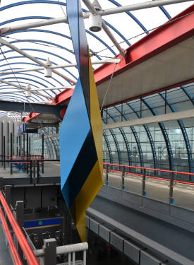 Onder: Een markant kunstwerk, dat in de vide tussen het hooggelegen perron en de stationshal is te zien. Het werd gemaakt door beeldend kunstenaar C.J. Marks. De uit Nieuw Zeeland afkomstige Marks, die vooral bekend werd als sieradenontwerper, maakte het kunstwerk als een soort eerbetoon aan een andere beeldend kunstenaar: Dunbar, de “geestelijk vader” van de bekende NS-huisstijl uit 1968. De kleuren geel en blauw zijn dan ook dezelfde kleuren als de NS-treinen.