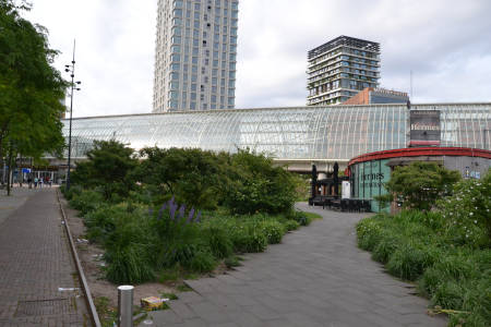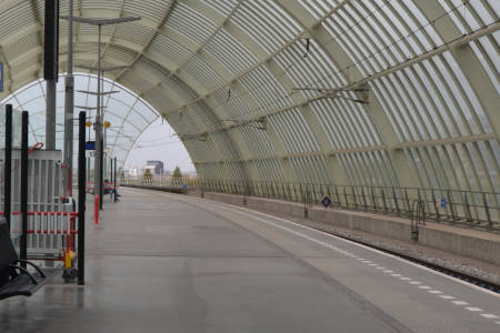 Boven en onder: Het meest markante deel van de laatste uitbreiding van het Sloterdijk-station is de glazen overkapping over de sporen 9 en 10. De bouw ervan was een behoorlijke uitdaging. Niet alleen ligt het perron in een bocht, ook wordt de overkapping in zuidelijke richting wat smaller. Het noordelijke uiteinde (foto onder) heeft dan ook een wat rondere vorm. Aan beide uiteinden zijn glaswanden geplaatst, met openingen voor de treinen. Het perron is hierdoor zo optimaal mogelijk beschut tegen weersinvloeden. Met een lengte van ruim 210 meter is dit veruit de langste overkapping van dit station. Ter vergelijking: de kap boven de Schiphollijn is zo’n zestig meter korter. En de drie lage perrons? Die hebben alleen de vloer van het stationsgebouw als beschutting...