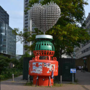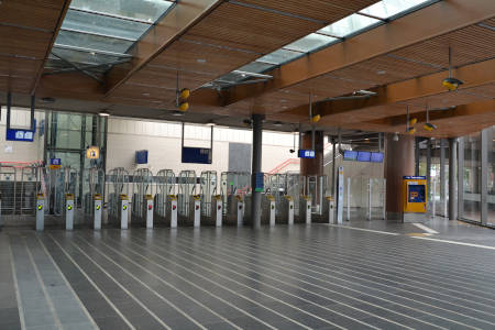 Via de trap, roltrap of lift komt men in een opvallend grote hal. Die beschikt alleen over een kaartautomaat en ov-poortjes, en is dus eigenlijk een grote, loze -maar wel fraai afgewerkte- ruimte. Met een aangename uitstraling, trouwens. Wellicht was de reden voor die grote hal het feit dat dit perron eigenlijk een autonome halte had moeten zijn, deze had dan de naam “Amsterdam Sloterdijk Hemboog” moeten krijgen. Om verwarring te voorkomen koos men er uiteindelijk maar voor om het een onderdeel van station Sloterdijk te maken. De spoornummers 9 en 10 zijn hier het overduidelijke bewijs van. Toch blijft het een wat merkwaardige constructie; een station, waar men voor de richting Purmerend naar een apart gedeelte moet gaan. Illustratief hierbij is een groot bord dat in de hal van het Hemboogperron hangt: voor de sporen 3 tot en met 8 en de sporen 11 en 12, 150 meter lopen… |
