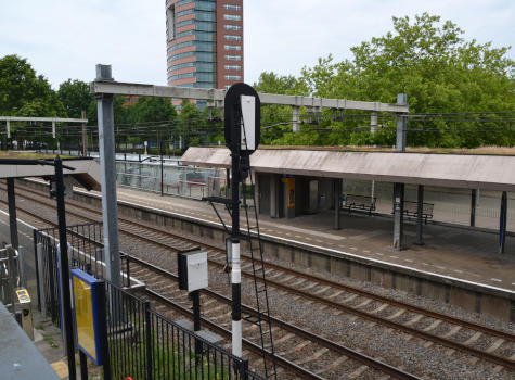 Boven: Station Breda-Prinsenbeek, gezien vanaf de in 2003 gebouwde fietsbrug. Dit station werd op 29 mei 1988 in gebruik genomen, in datzelfde weekeinde werd ook station Lelystad Centrum geopend. Eigenlijk had deze halte “Haagse Beemden” moeten heten, naar de wijk dat pal naast het station ligt. Naar het schijnt werd die naam op verzoek van het toenmalige gemeentebestuur van Breda gewijzigd in de naam die het station ook nu nog draagt. Toen het station werd geopend was Prinsenbeek namelijk nog een zelfstandig dorp en een zelfstandige gemeente, de halte stond destijds letterlijk op de gemeentegrens. Wellicht dat om die reden de stationsnaam met een koppelteken wordt geschreven. Inmiddels is Prinsenbeek al bijna dertig jaar een stadsdeel van Breda, maar dat streepje is altijd gebleven. Vanaf het viaduct is goed te zien dat op de daken van de gebouwtjes mos ligt, een soort natuurlijke “dakbedekking”? Ook opvallend: één van de bovenleidingportalen steekt dwars door het dak van het perrongebouw. Dit is trouwens in een later stadium gebeurt, het gebouwtje was in ieder geval niet op deze wijze opgeleverd. De hoge flat op de achtergrond is de Luchtmachttoren. Zoals die naam al doet vermoeden is hier het hoofdkwartier van de Koninklijke Luchtmacht gevestigd.