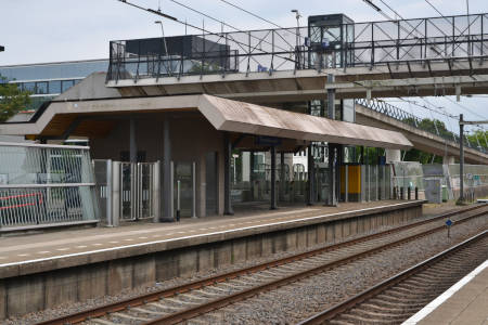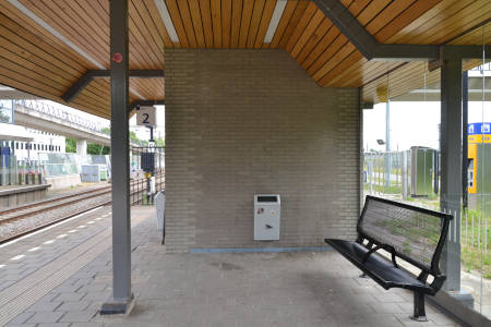 Onder: In 2008 werden beide perrongebouwen flink “verbouwd”, waarbij de oorspronkelijke gevels eruit werden gesloopt en werden vervangen door glazen wanden. Hetzelfde gebeurde in die tijd bij meer stations van dit type. Wel kregen de plafonds een fraaie afwerking, hetgeen toch wel een cosmetische verbetering genoemd mag worden. Dit is trouwens het kleinere gebouwtje, dat langs spoor 2 staat.