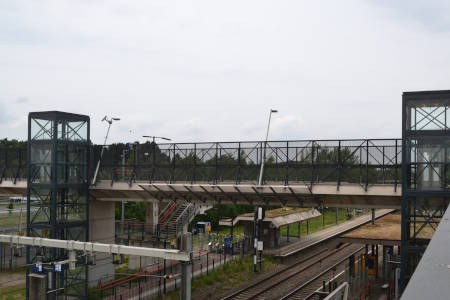 Onder (beide foto’s): De fietsbrug, die mede het huidige aangezicht van het station bepaald. Het viaduct overspant de spoorlijn Breda – Lage Zwaluwe, de snelweg A-16 en de Hogesnelheidslijn. Over deze “Moskesbrug”, zoals ze officieel heet, is veel te doen geweest. Toen het in 2003 werd gebouwd konden fietsers er alleen middels roltrappen of liften op, hellingbanen waren er nog niet. Pas na tussenkomst van de rechter werden deze later alsnog geplaatst, zij het dat deze vrij smal en behoorlijk steil zijn. Overigens is het tweede perron uitsluitend via dit viaduct te bereiken...
