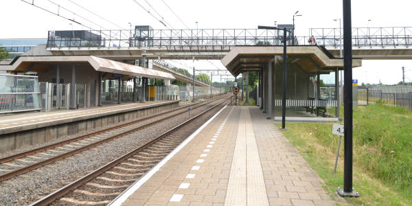 Onder: Een blik op de perrons, met op de achtergrond de beruchte Moskesbrug. Op deze foto is niet te zien dat de twee gebouwtjes bepaald niet even groot zijn, het gebouwtje op het tweede perron (rechts) is bijna de helft kleiner. Ook staat het wat verder naar het noorden dan het gebouw op het tegenoverliggende perron. Waarom voor deze “verschoven” opstelling is gekozen is mij niet bekend.