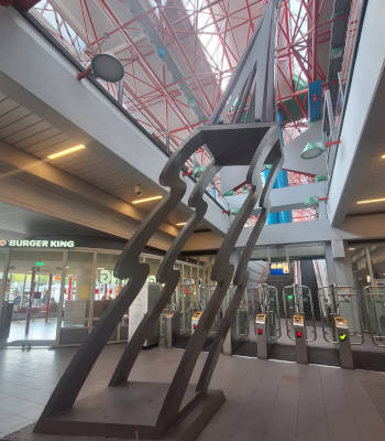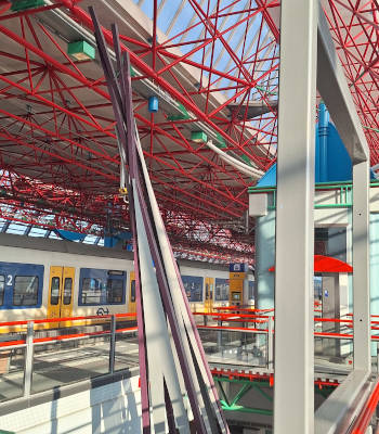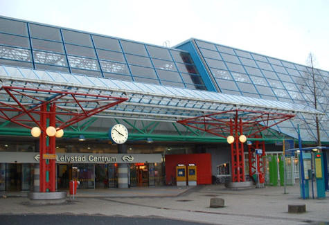 Terug nu naar station Lelystad Centrum. Hoewel lang niet iedereen het met mij eens is, is het een fraai en interessant station, een hoogtepunt uit de jaren-tachtig architectuur. Net als station Almere Centrum is het een viaductstation, met ook hier een kenmerkende, rode spaceframe-overkapping. Anders dan bij het Almeerse station werden hier de mogelijkheden van een viaductstation minder optimaal benut, zo werd hier het busstation niet onder, maar vóór het station geplaatst. Wat station Lelystad Centrum wel als grote voordeel heeft, is dat belangrijke instanties (provinciehuis, rechtbank en stadhuis) in de directe omgeving van het station zijn te vinden.