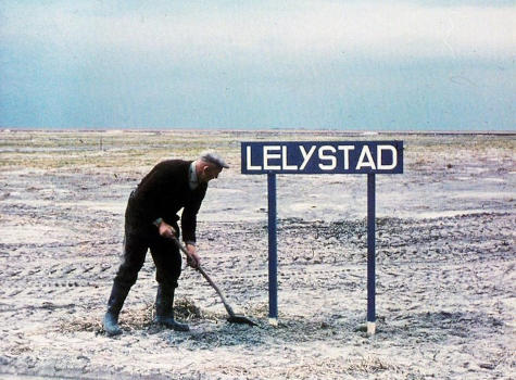 Boven: Een -zeker in Lelystad- bekende foto van het (onofficiële) eerste plaatsnaambord. De foto dateert uit 1965, de tijd waarin het bouwrijp maken van de eerste woonbuurten begint. Over de plaats waar deze moest komen was veel te doen geweest. Uit kostenoverwegingen werd besloten deze landinwaarts te bouwen, in plaats van aan de kust te beginnen. Een gemiste kans, die pas in de afgelopen twintig jaar (enigszins) is rechtgezet. In die eerste jaren was het echt pionieren in Lelystad. De polder was nog een kale vlakte, winkels waren er amper en de A6 en de Flevolijn moesten nog worden aangelegd...