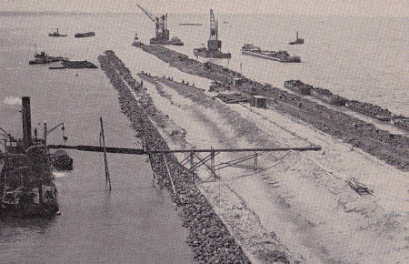 Onder: De aanleg van de polder Oostelijk Flevoland begon met de bouw van een werkeiland. Van daar uit werd een 90 kilometer lange ringdijk gebouwd, zoals op deze ansichtkaart uit het midden van de jaren vijftig is te zien. De ringdijk kwam op 13 september 1956 gereed, ruim negen maanden later viel Oostelijk Flevoland droog.