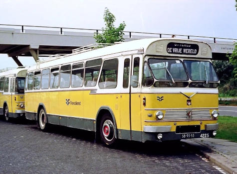 Boven: Wie geen eigen auto had was in Lelystad tot 1988 volledig afhankelijk van het busvervoer. Lelystad had in de beginjaren zelfs een eigen streekbusmaatschappij, de Flevodienst. Op deze foto staan twee Leyland-Verheul semi-tourbussen gereed bij het busstation Noorderwagenplein, in de jaren zeventig was dit het “hoofdbusstation” van Lelystad. Op de voorste bus staat als bestemming “De Vrije Wereld” aangegeven. Mogelijk wordt hiermee het oude land bedoeld (zo noemen wij polderlingen het gebied buiten de Flevopolder), maar het kan ook een soort politiek statement zijn geweest. Deze specifieke bus werd in 1958 gebouwd, en reed oorspronkelijk voor de Autobusonderneming Salland. In 1972 werd ze door Flevodienst overgenomen, waar ze tot 1977 dienstdeed. De Flevodienst hield in 1981 op te bestaan, ze ging verder onder de naam VAD (Verenigde Autobus Diensten). De VAD werd later “Midnet”, dat op haar beurt weer opging in “Connexxion”. Op de achtergrond is één van de karakteristieke fietsbruggen te zien, waar Lelystad bekend om is geworden. De fiets/voetgangersviaducten hebben (bijna) allemaal een naam. Dit is de Veluwsebrug, het is de oudste van Lelystad.