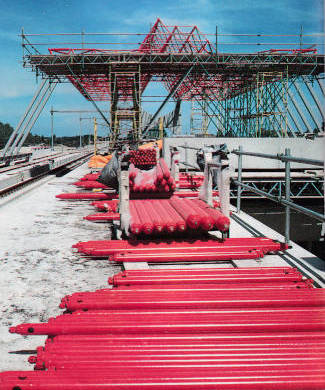 Onder: Station Lelystad Centrum in aanbouw. Op 6 mei 1982 sloeg de toenmalige minister van verkeer en waterstaat mr. H. Zeevalking de eerste paal van het nieuwe station, exact één jaar nadat burgemeester Gruijters het startsein voor de bouw van de Flevolijn had gegeven. (zie ook de afbeelding hierboven) Op deze foto uit 1987 begint het station haar bekende vorm te krijgen.