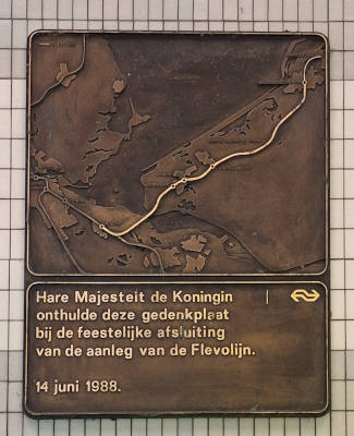 Onder: Op 14 juni 1988 bracht koningin Beatrix een werkbezoek aan Lelystad, ze bezocht daarbij de Bataviawerf en het enige maanden tevoren afgebrande museum Nieuw Land. Ook onthulde de vorstin deze gedenkplaat in het gloednieuwe station Lelystad Centrum. Hiermee was de Flevolijn definitief voltooid, al was deze toen al ruim twee weken in gebruik…